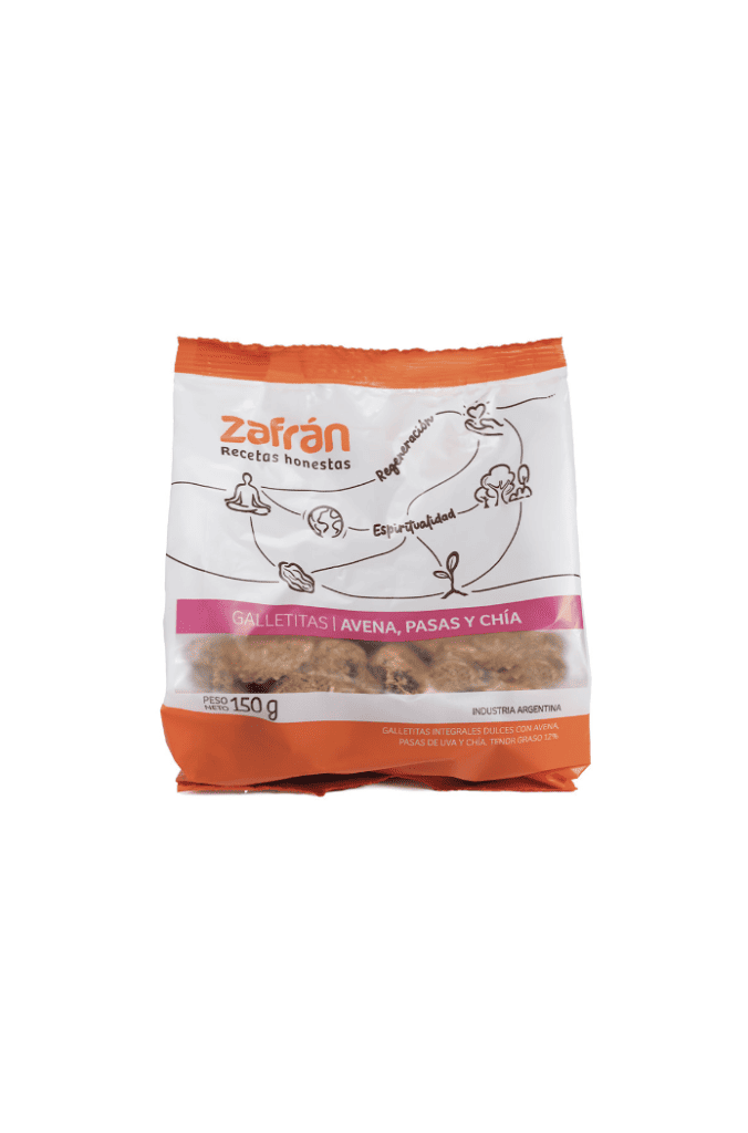 Galletitas dulces 100% integrales con avena, pasas de uva y semillas de chía. Aptas vegano.