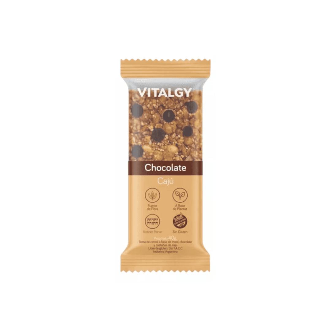 Barra de cereal a base de mani, chocolate y castañas de caju. Libre de gluten, Kosher Parve, A Base de Plantas, Fuente de Fibra.