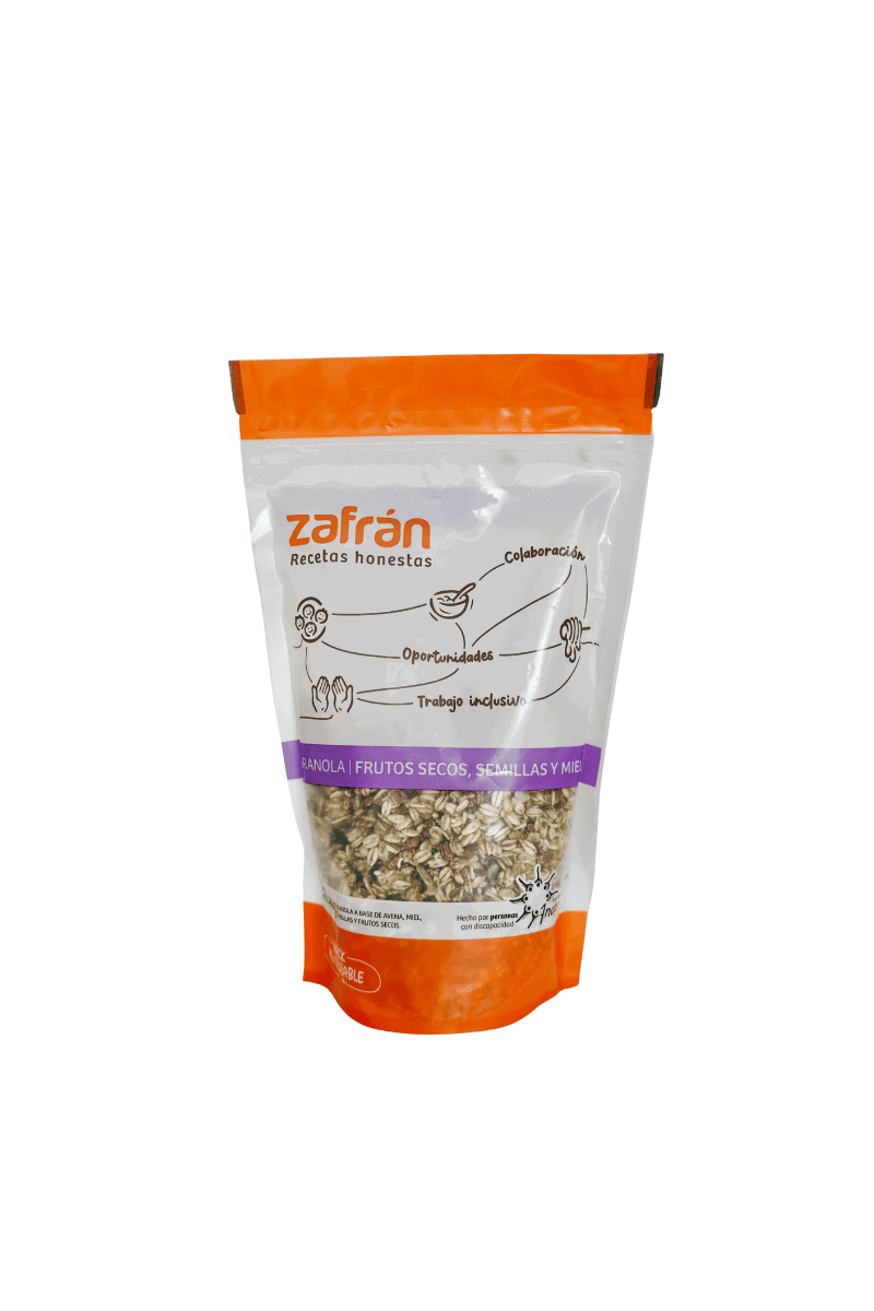 Granola a base de avena, arroz yamaní inflado, frutos secos, semillas activadas y miel.