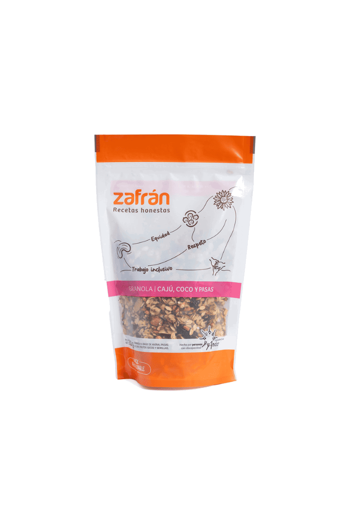 Ingredientes: Avena arrollada, arroz yamaní inflado, pasas de uva, azúcar mascabo, castañas de cajú, maní, semillas de lino, semillas de chía y coco en escamas.