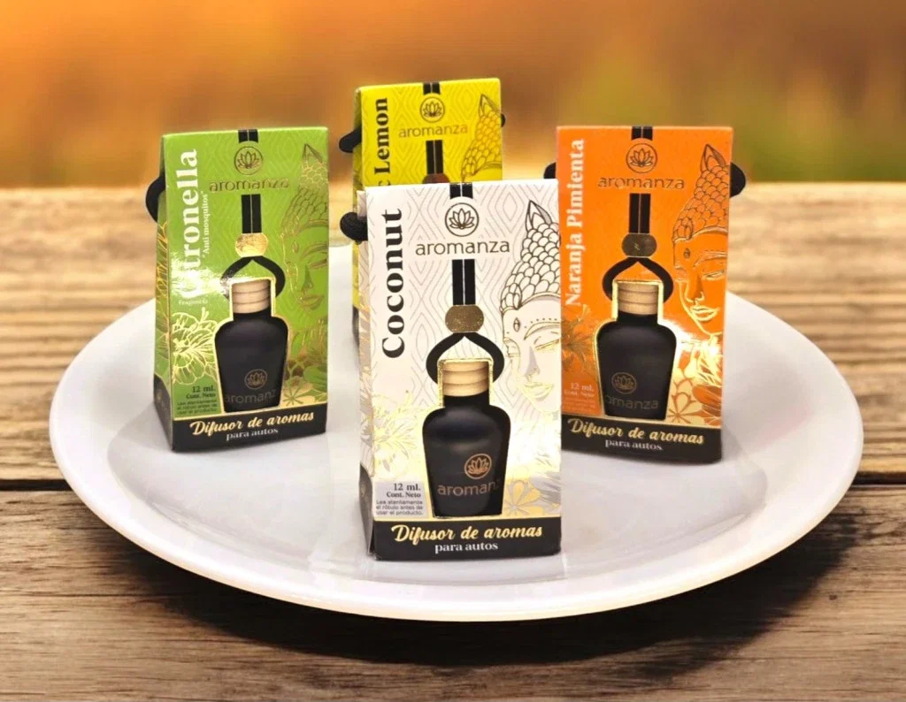 Los difusores para auto Aromanza de 12 ml son aromatizantes líquidos colgantes, diseñados para colocarse en el espejo retrovisor y transformar tus viajes con fragancias premium.